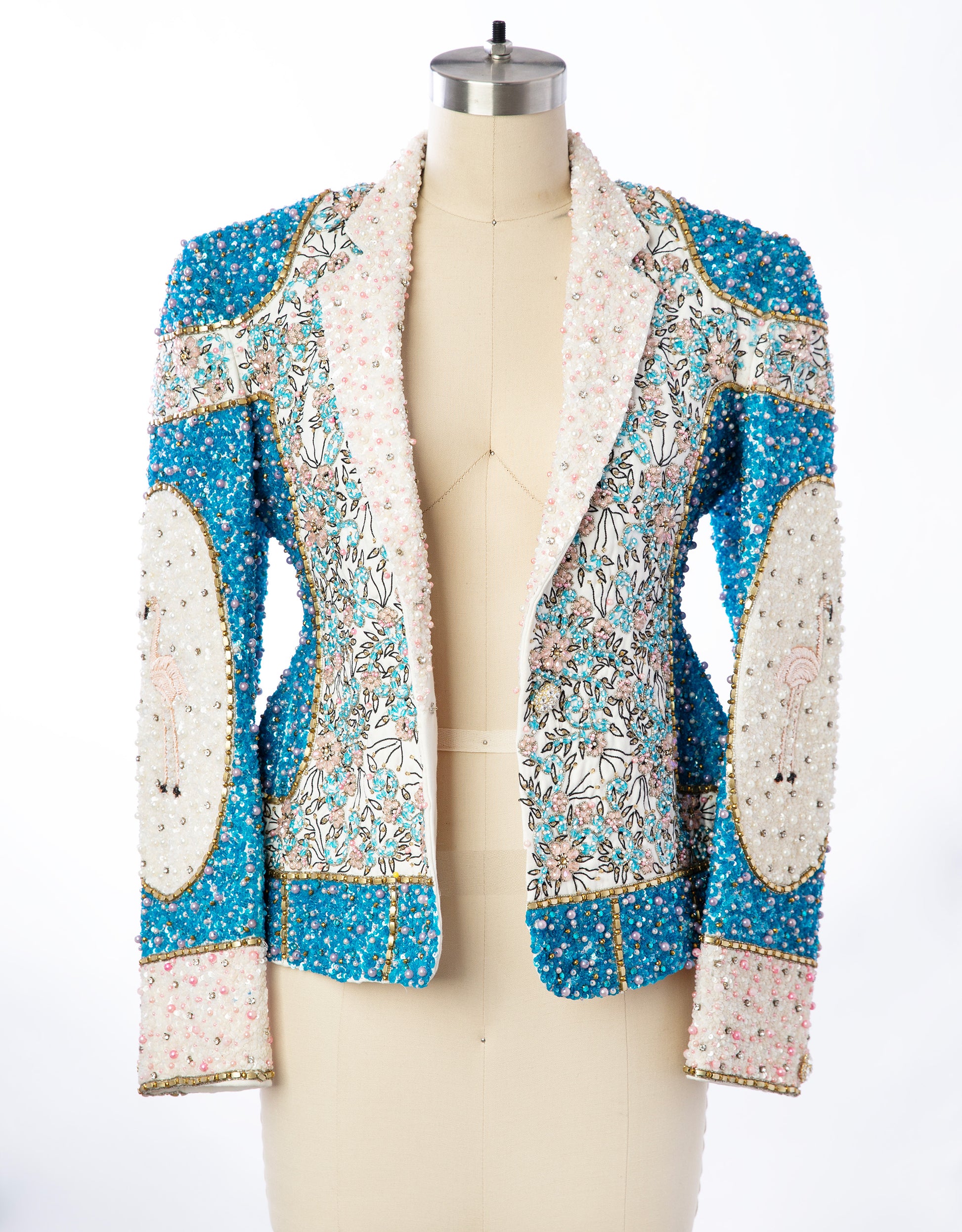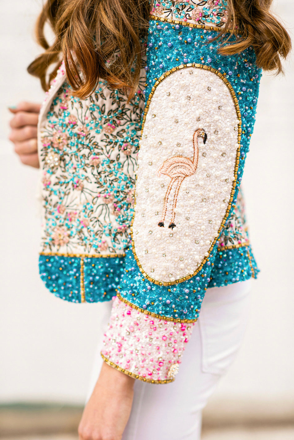 The sleeve continues the sequence technique, incorporating playful electric blue sequins. A delightful pink flamingo takes center stage in the midst of the sequence, surrounded by a mix of cream sequins and pearls. This charming touch adds a sense of whimsy and playfulness to the jacket's overall elegance.