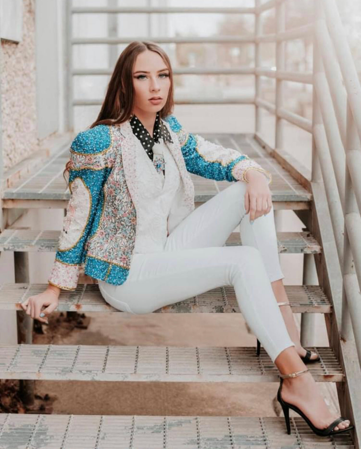 A touch of opulence is brought to life by the gold trim and metallic block beads, accentuating the edges of the jacket and creating a sense of luxury that perfectly complements the vibrant color palette.