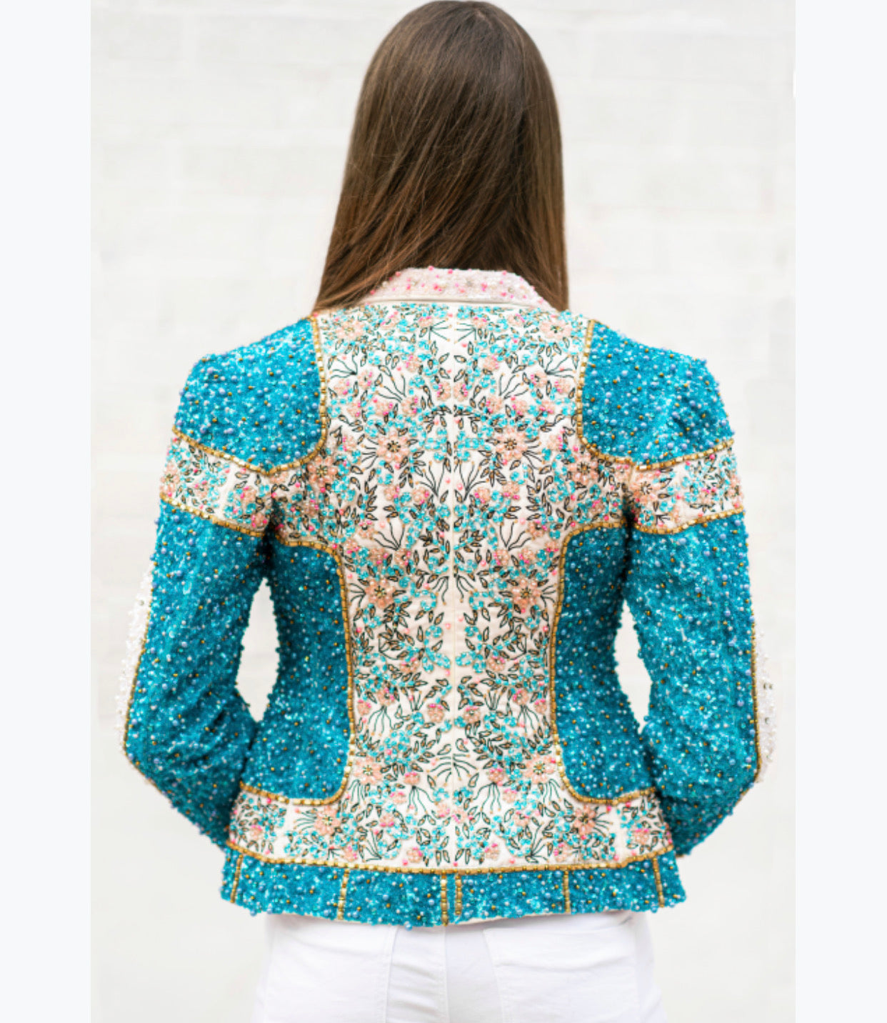 Indulge in the allure of the "Elegant Electric Blue Symphony," a masterpiece that harmonizes electric blue sequins and lustrous pearls in a dynamic block pattern. This made-to-measure jacket, crafted from the finest cream neoprene fabric, black thread and delicate light pink glass stones create a mesmerizing foundation, while a whimsical pink flamingo amidst cream sequins adds a playful touch. The jacket's opulent gold trim with metallic block beads exudes luxury, completing this wearable work of art. Experience the enchantment of this radiant creation, a true testament to the fusion of elegance and whimsy on the canvas of neoprene luxury.