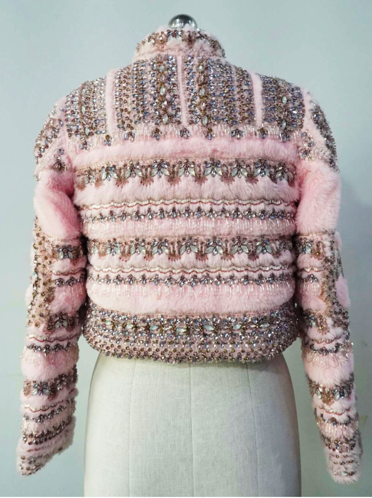 Pink Faux Fur Elegance: This jacket boasts a luxurious pink faux fur texture that exudes opulence and warmth, making it a quintessential choice for colder seasons.