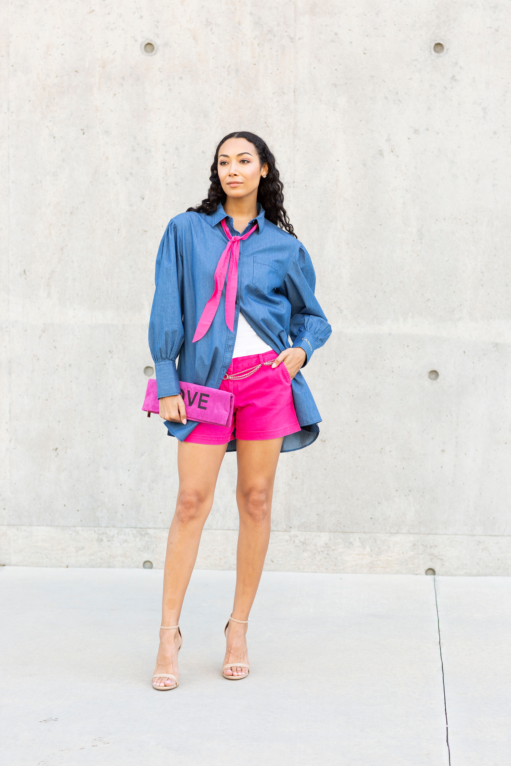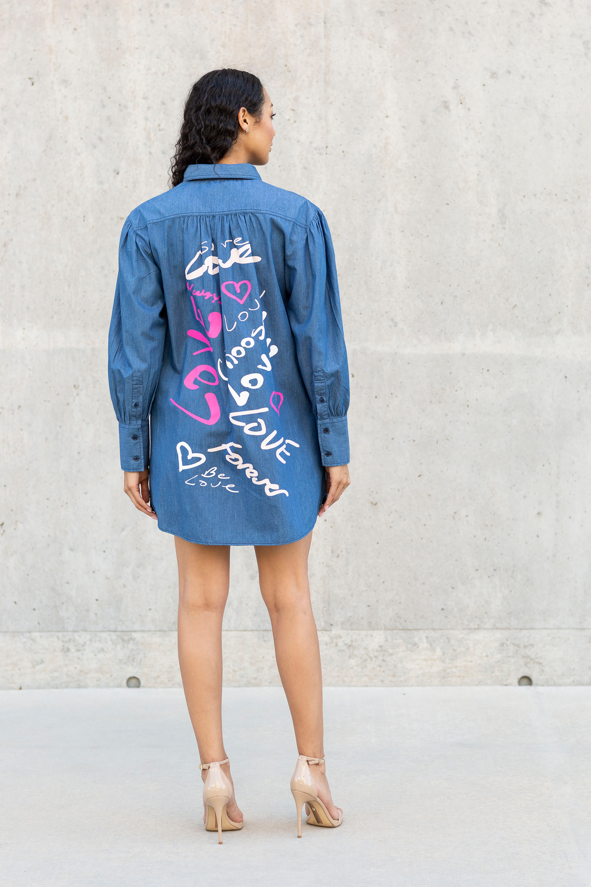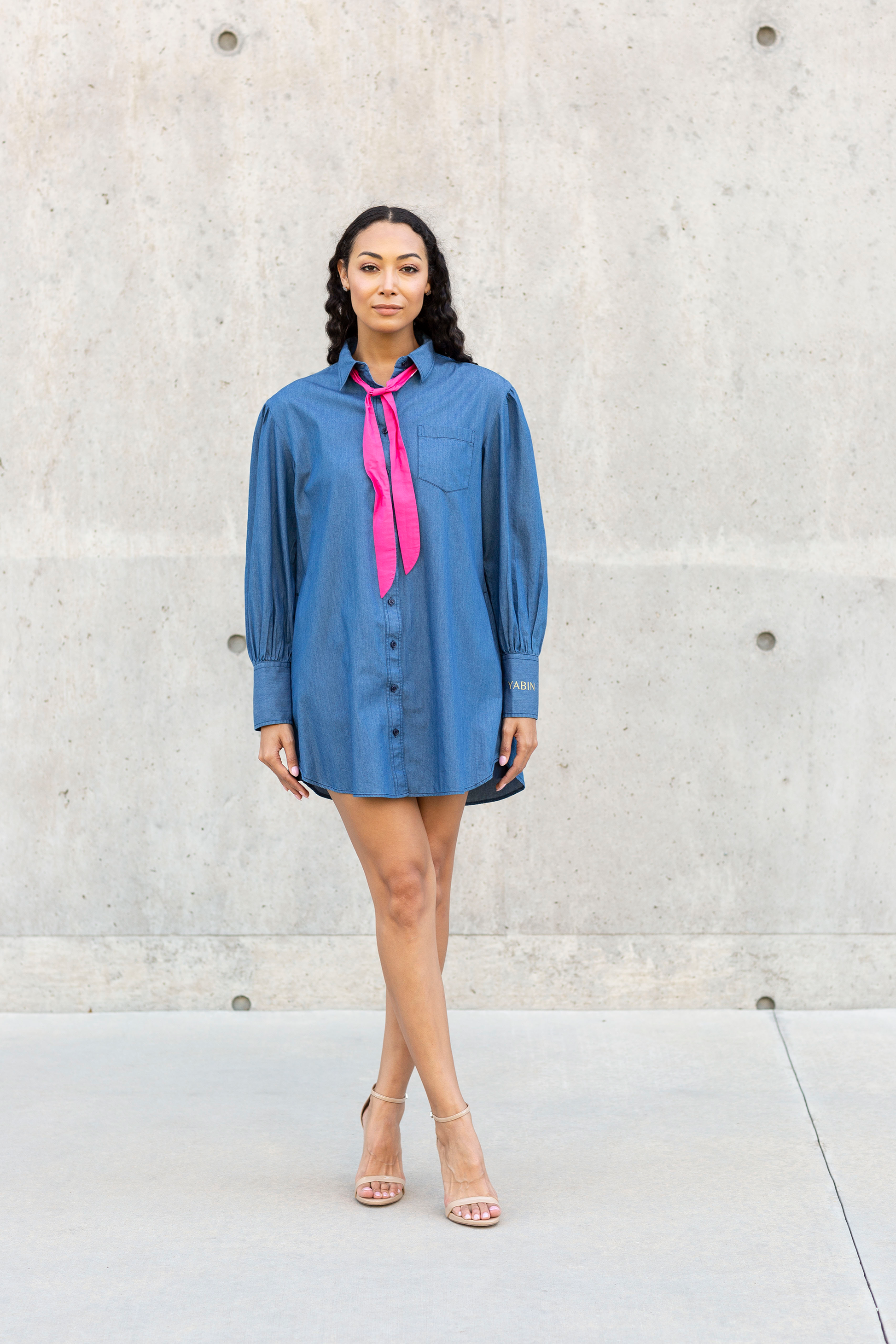 The L10 Love Shirt Dress by Yabin is a must-have for those who want to make a statement. Made from dark chambray fabric, this dress features Yabin's handwriting with the messages "choose love," "be love," and "share love" on the back. The fuchsia statement bow adds a pop of color, while the front top pocket and side pockets provide functionality. This dress reinforces Yabin's message and focuses in on the 3rd Edition Collection.