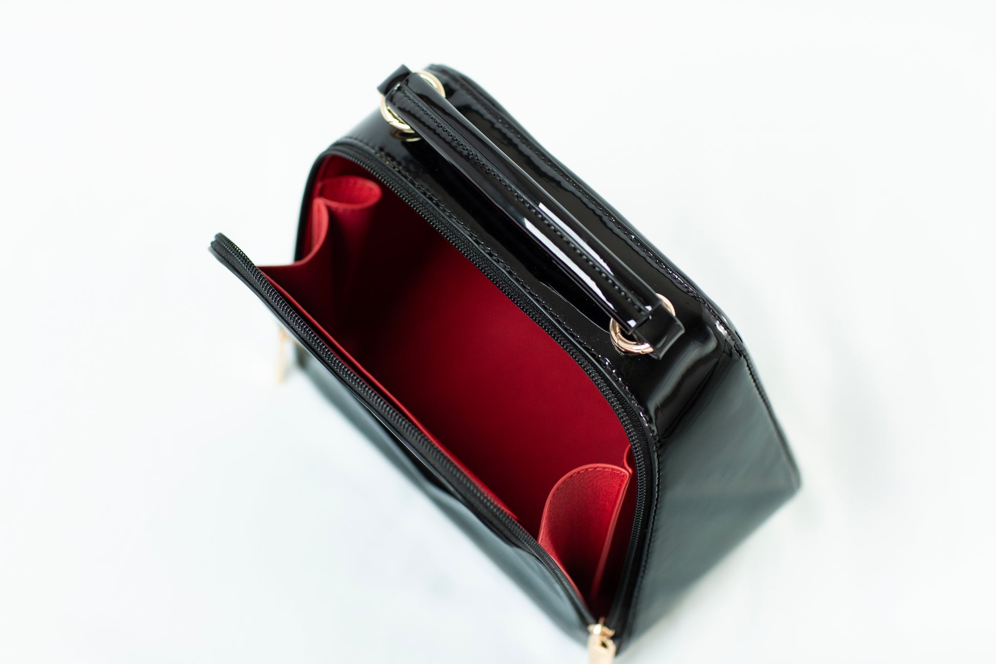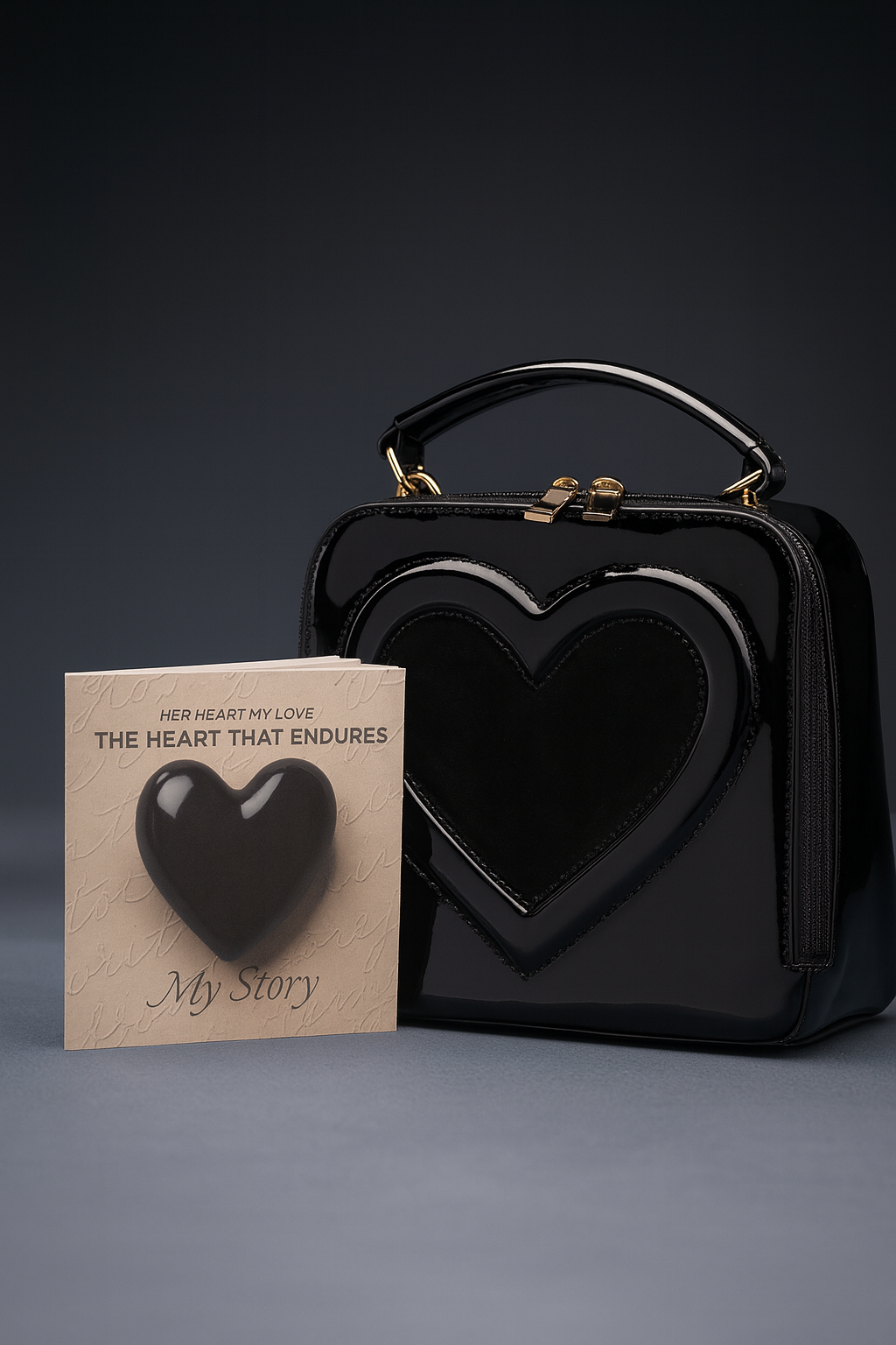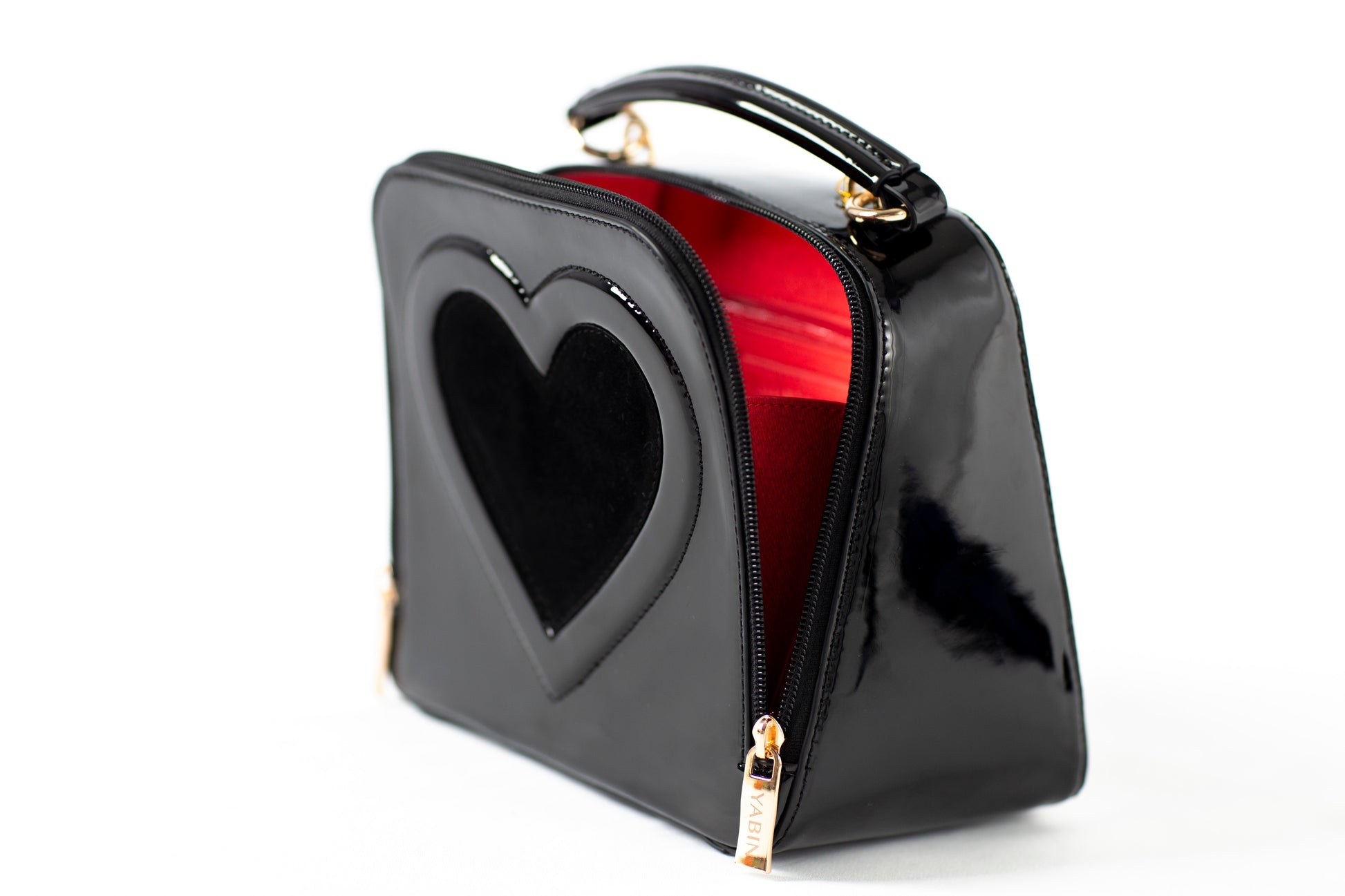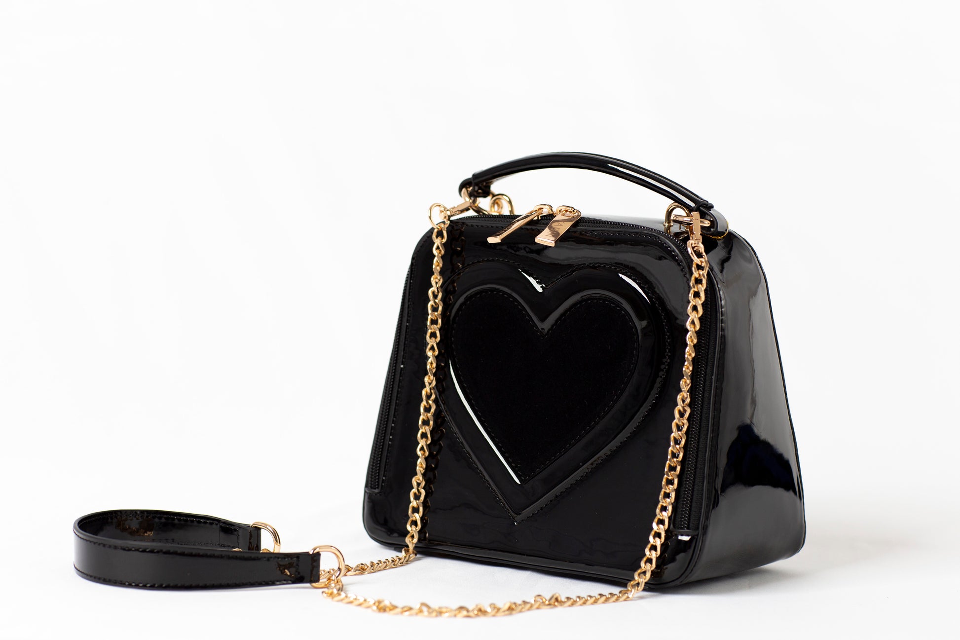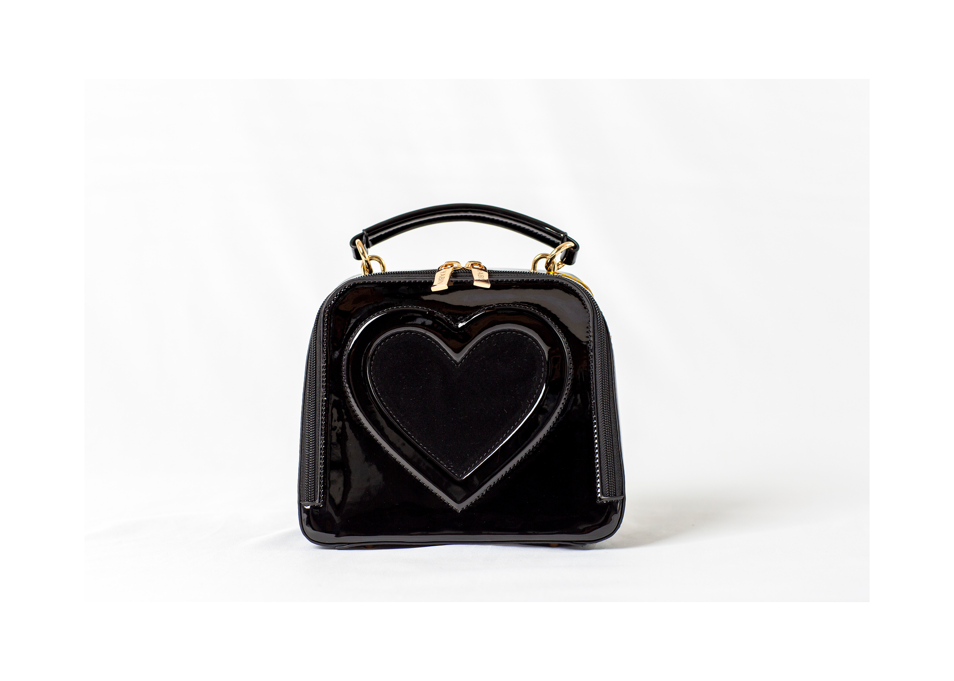 Crafted in high-gloss black patent PU leather, this trapezoid-shaped bag features a raised stitched heart with a soft ultrasuede center.