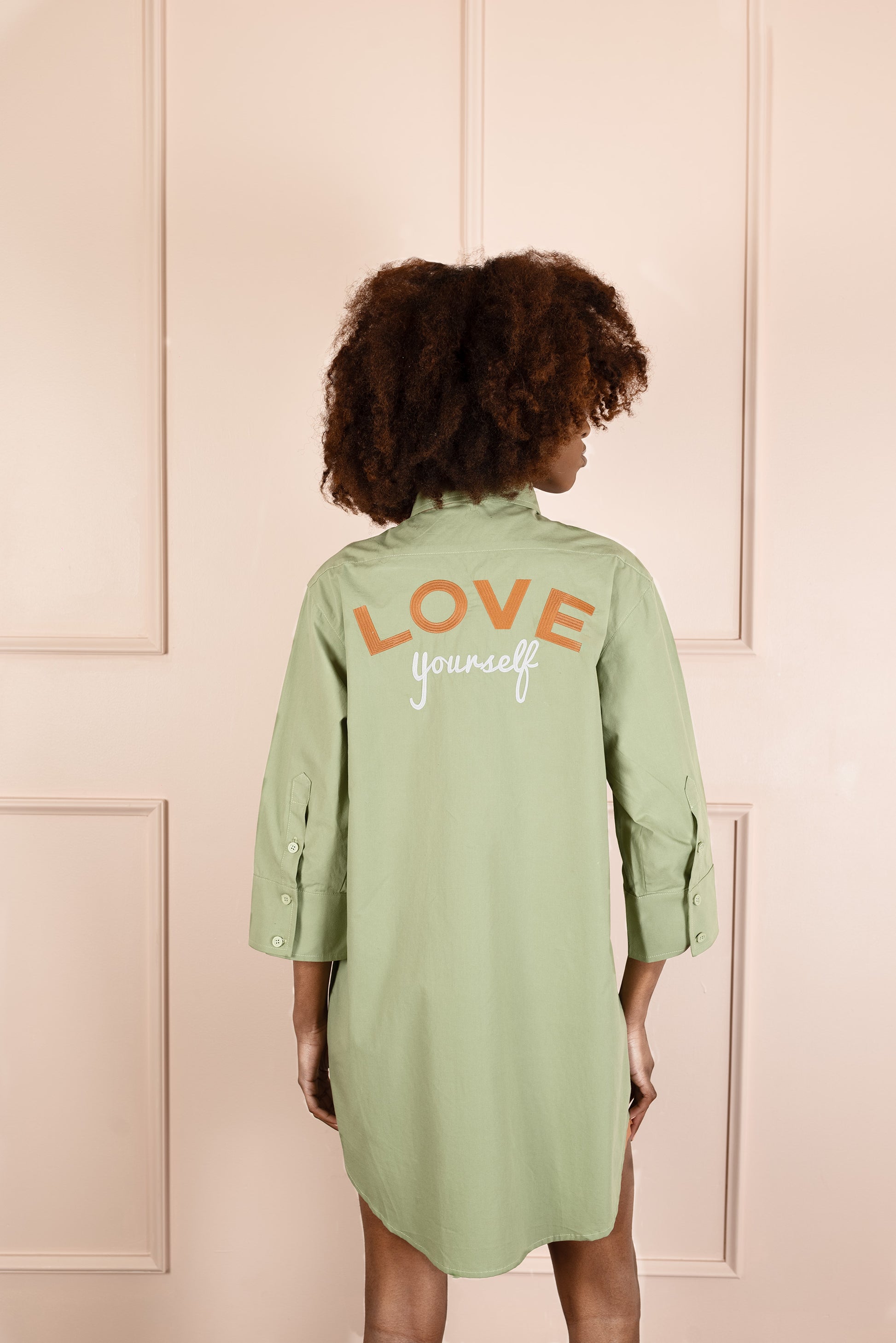 - The word ‘LOVE Yourself’ is embroidered boldly on the back in Ginger and grey.