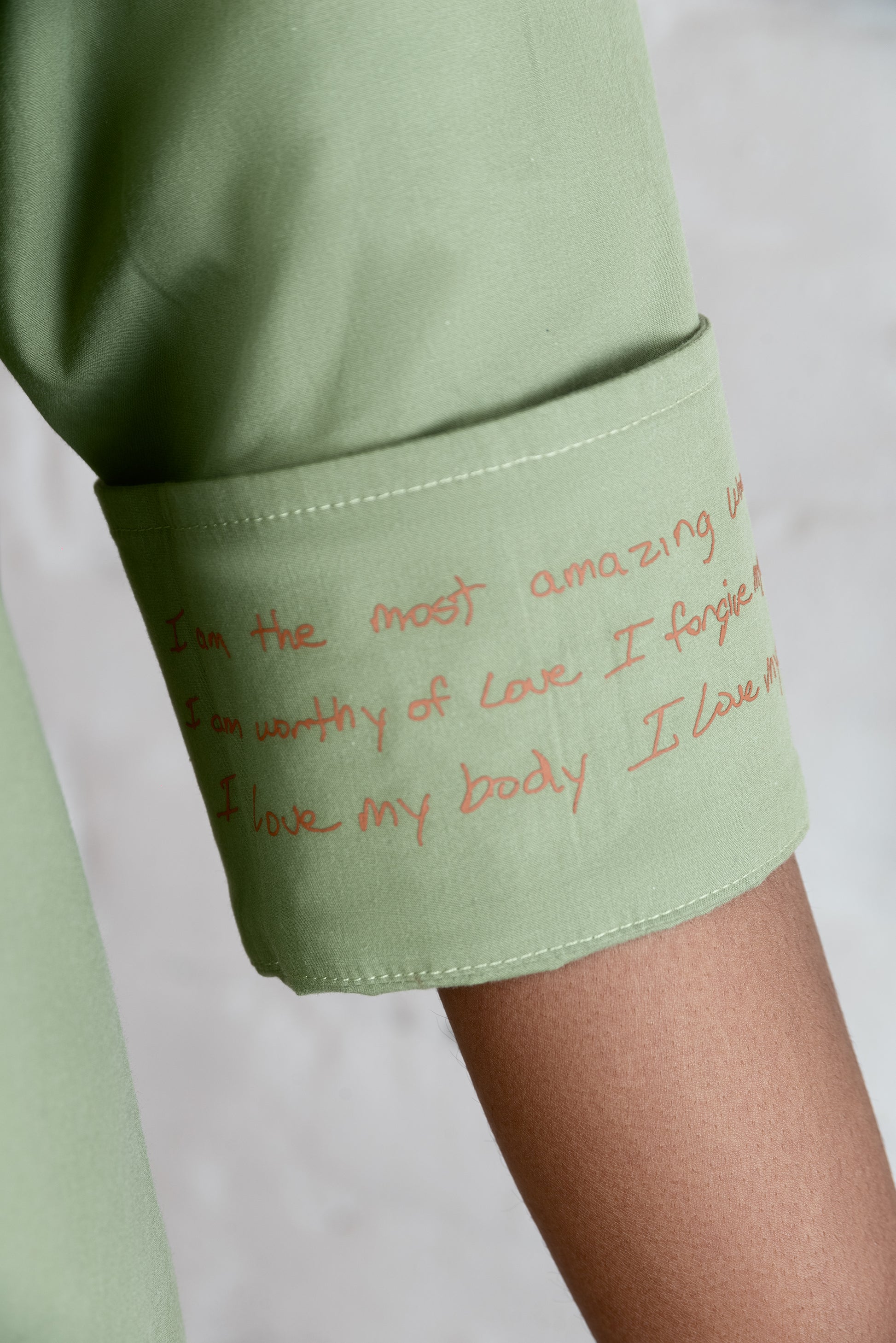 - 3/4" length sleeves and a 3" cuff with positive affirmations written with Yabin's own hand.